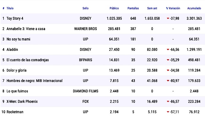 Por otra parte, durante el último fin de semana (jueves a domingo en realidad) Toy Story 4 sumó poco más de un millón de entradas en 648 salas con una caída lógica del 38% respecto del debut (el jueves anterior además había sido feriado). Con el acumulado de más de 3,3 millones de personas en solo 11 jornadas tiene todo encaminado para convertirse en el film más visto de todos los tiempos (para eso debería llegar después de las vacaciones de inverno a los 5 millones). Tendrá desde este jueves 4 duros rivales como la nueva entrega de Spiderman y otro film animado como La vida secreta de tus mascotas 2.