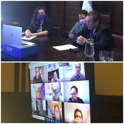 El Ministro de Cultura de la Nación, Tristán Bauer, junto a la Secretaria de Desarrollo Cultural, Lucrecia Cardoso; Claudio Martínez, Subsecretario de Medios y Comunicación Pública; el Vicepresidente del INCAA, Nicolás Batlle y el Subgerente de Desarrollo en Seguridad y Salud, David Traetta, de la Superintendencia de Riesgos de Trabajo del Ministerio de Trabajo, Empleo y Seguridad Social, presentaron, de manera virtual, el protocolo para el rodaje-grabación y postproducción de contenidos para cine, televisión y plataformas de streaming.