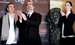 La lectura de los candidatos la llevaron a cabo la actriz Paz Vega y el cineasta Javier Fesser, ganador el año pasado de seis estatuillas por la película Camino, en la sede madrileña de la Academia de las Artes y las Ciencias Cinematográficas de España, bajo la presidencia de Alex de la Iglesia (los tres en la foto).